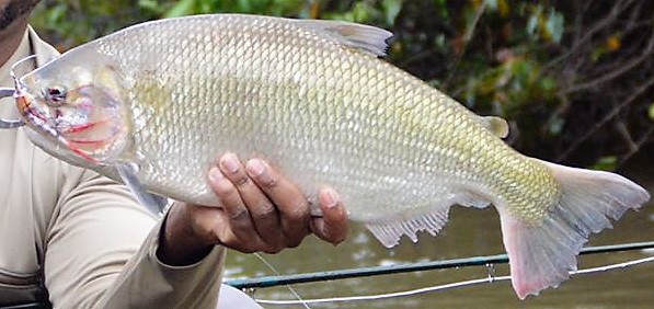 Brycon amazonicus, whenever you feel a strong strike and an inmediate jump along structure such as rocks and snatches, then it may be a Yamu. This is an awesome game fish that can reach up to 20 pounds. Most common size are 6 to 8 pounds though you may have a surprise! This fish love flies, spinner baits and will also strike poppers.